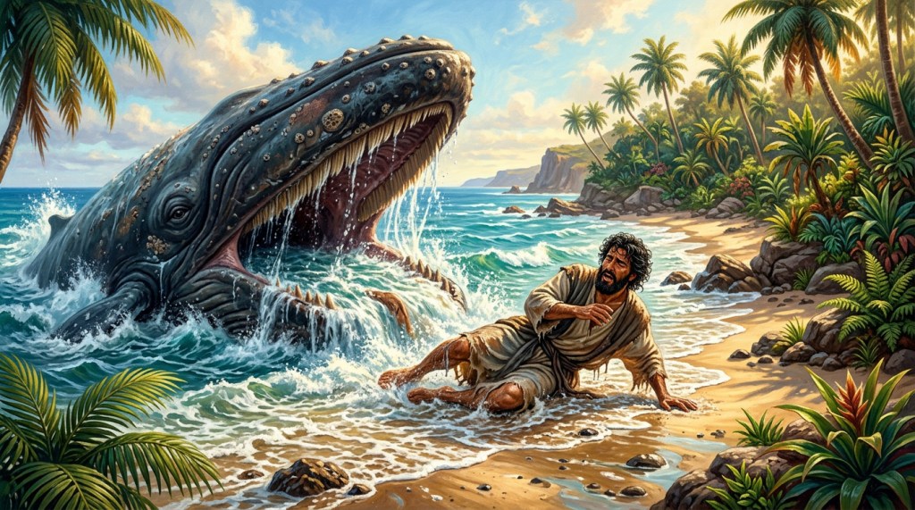Jonah’s Descent (Jonah 2:1-10 KJV) records the prophet cast into the sea, praying “out of the belly of hell [Sheol]” while “the depth closed me round about… I went down to the bottoms of the mountains; the earth with her bars was about me for ever.” God commands the fish to vomit him onto dry land.